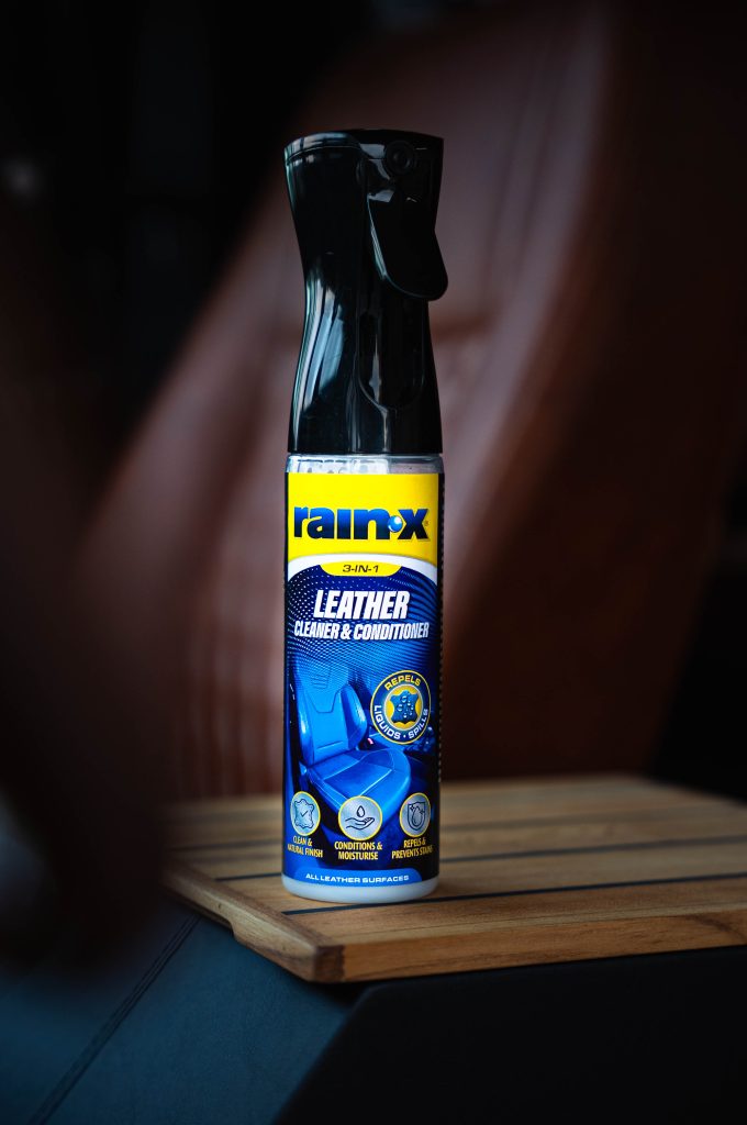 A bottle of Rain-X Leather cleaner in a car
